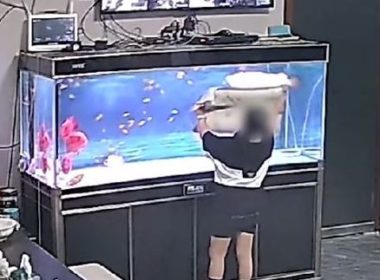 小屁妹挑釁金龍魚!拿枕頭狂遮視線 牠「怒衝破頂蓋」重摔地面